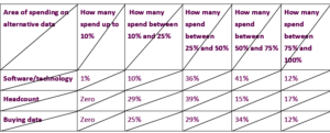 The table below shows how investment organisations surveyed estimate spending on alternative data management, staffing and datasets breaks down.