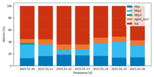 The group operates a notorious DDoS botnet called DDoSia, which is usually the facilitator of HTTP flooding attack traffic. However, in this instance, the adversary primarily deployed TCP-based attack methods, diverging from their usual tactics, and aligning with ASERT’s previously observed attack patterns. We show the percentage of different methods facilitated through the botnet in Figure 2.