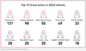 Equally notable is the centralisation of attacker groups. The majority of observed DDoS events were claimed by a small cluster of highly active hacktivist operators. Keymous+, for instance, was responsible for 121 attacks, while NoName057(16) executed 98, each operating high volume, rapid fire campaigns across multiple countries and sectors. Their tactics relied on readily accessible botnets and shared infrastructure, allowing even moderately skilled actors to scale their impact.