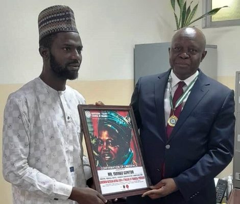 A delegation of the organisation led by the National President, Dr. Isa Ododo, presented a plaque for award of Garwuwan Matasan Arewa Nigeria (literally translated as ‘Shield of Niger Northern Youth’) during a visit to Gontor in his office at the Commission in Abuja recently.