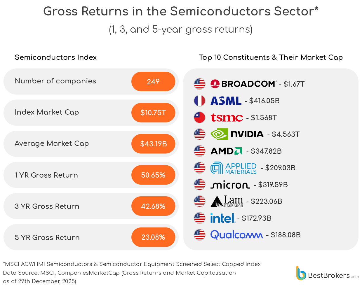 To find out which sectors and companies led the market in 2025, BestBrokers analysed global performance using the MSCI ACWI Indexes, which cover 20 industries across 49 countries, from Information Technology and Semiconductors to Energy, Health Care, and Consumer Discretionary.