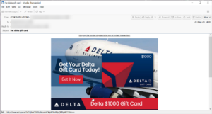 Same thing here. It’s a relatively convincing-looking image of a Delta gift card offer. But again, the URL doesn’t point to Delta.
