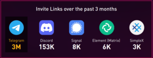 Despite brief experimentation with alternatives, Telegram remains the platform of choice. Over the last three months alone, Check Point Exposure Management identified approximately 3 million Telegram invite links shared across underground environments. By comparison, Discord accounted for fewer than 6 percent of that volume, while Signal, SimpleX, and Matrix-based platforms barely registered.