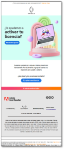 This phishing email, which uses Abode’s branding, was sent from the address grupovesica@adobe-partner[.]com, and its subject, originally in Spanish, read – “Activate your license! Take advantage of its benefits” (originally: “¡Activa tu licencia! Aprovecha sus beneficios”). In the email the victim is encouraged to contact experts to help utilize the application license.